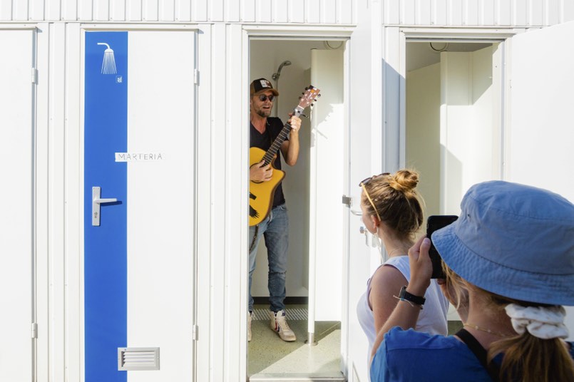 Einlasskontrolle im örtlichen Schwimmbad, beim Abbau des Festivals: Clean-Up Beachcamp